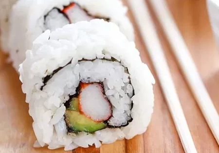 An inside-out maki/roll made with crab and avocado. The Vancouver chef who claims he invented it said its name is derived from the first letters of the main ingredients, which happen to be the abbreviation for a US state.