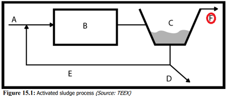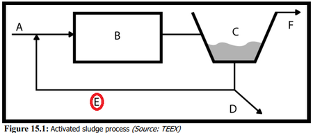 only one path returns anything to any previous portion of the process illustrated below. D would be Waste Activated Sludge(WAS) for removing excess solids and old sludge. E returns activated sludge to the aeration basin to ensure the microorganisms("bugs") are present and sufficient to maintain the digestion process in the aeration basin. A represents your influent and F represents your effluent.