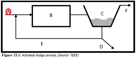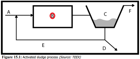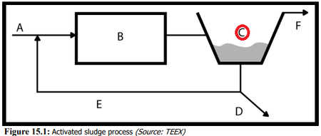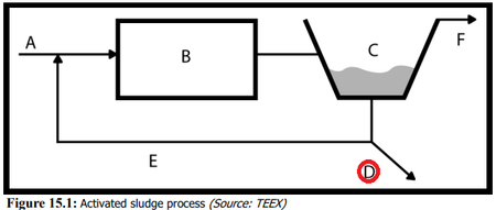 Only two actual pieces of equipment are shown in the below illustration. B would indicate your aeration basin and C is your secondary clarifier from which your activated sludge is obtained to reseed the aeration process..