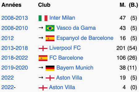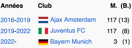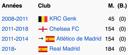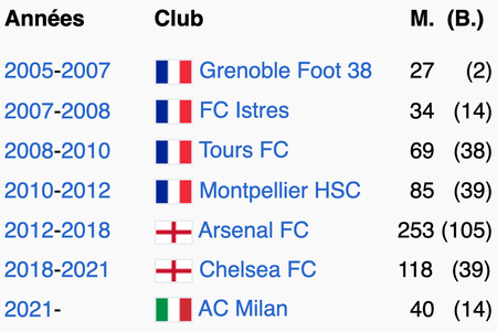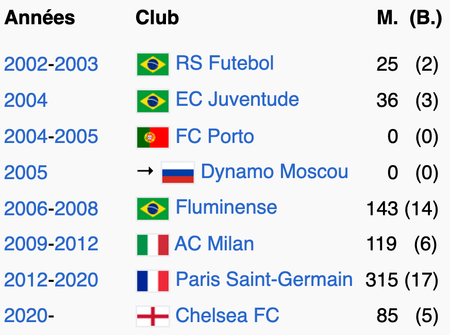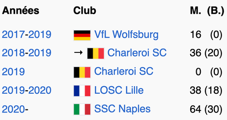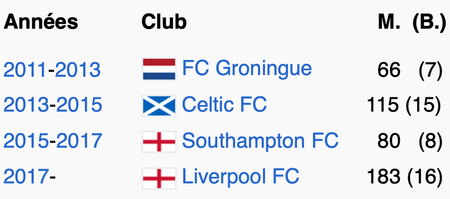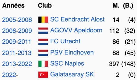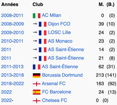 M. = nombre de matchs joués ; (B.) = nombre de buts marqués