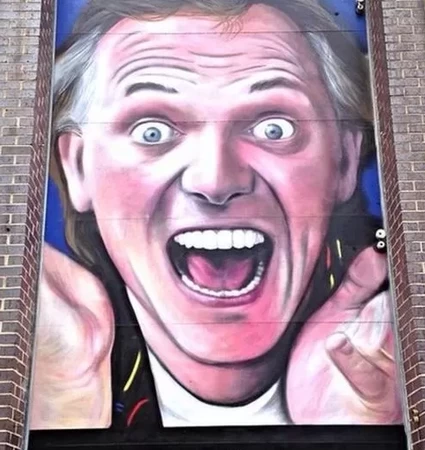 Name the comedians pictured. One image is a mural painted in tribute shortly after that person's untimely passing. You need only type in surnames.