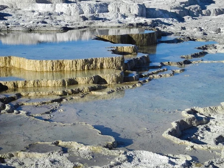 Pictures in order: Mammoth Hot Springs, Valley of Geysers (Kamchatka Peninsula, Russia), Grand Prismatic Spring, Lower Falls of the Yellowstone River