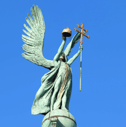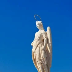 1 : l'archange saint Gabriel à Budapest, 3 : l'archange saint Raphaël au pont romain de Cordoue, 4 : l'archange saint Michel au Château Saint Ange de Rome.
