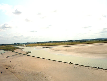 Sur la photographie de la commune du Mont-Saint-Michel, prise par votre obligé, on devine le Couesnon avec le pont-barrage. Les côtes bretonnes se trouve donc à droite sur la photographie.