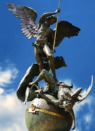 Réalisée par Emmanuel Frémiet en 1897, la statue de l'archange saint Michel sur le Mont-Saint-Michel représente saint Michel terrassant le dragon, symbole de la victoire du bien sur le mal. La statue de cuivre repoussé, dorée, mesure 4,5 mètres de haut, pèse 520 kg et sert également de paratonnerre.