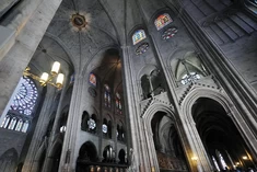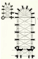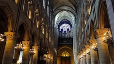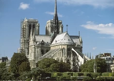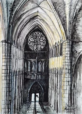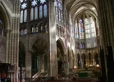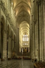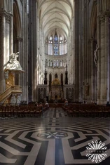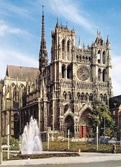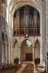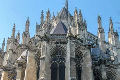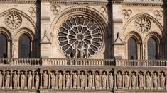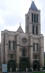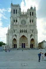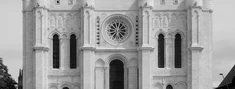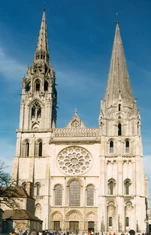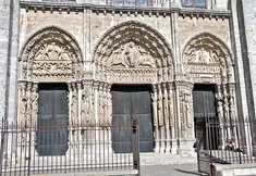 jej fasadę zdobią trzy portale, galeria królów z 22 posągami oraz wielka rozeta witrażow