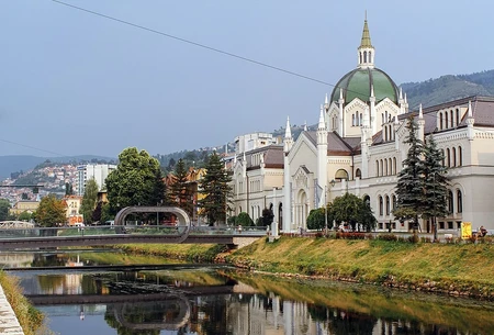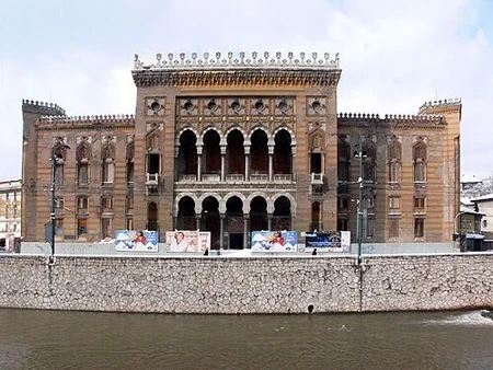 Image n°1: Pont courbé à Mostar Image n°2: Palais des beaux arts Image n°3: Pont latin (Non loin où François-Ferdinand a été assassiner) Image n°4: Bibliothèque Nationale de Bosnie-Herzégovine