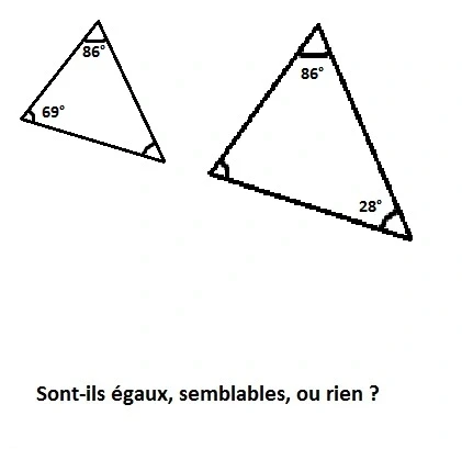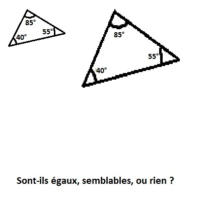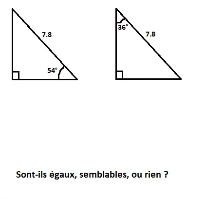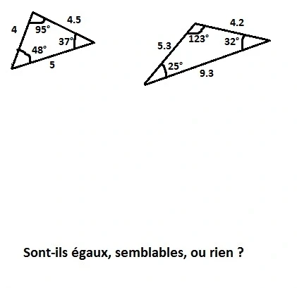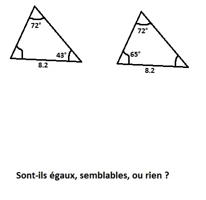 Réponds aux images en disant si les triangles sont semblables, égaux ou rien.
