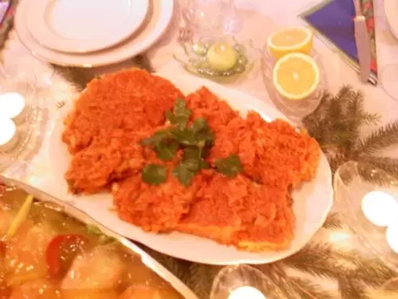Zmielone rybne mięso z m.in. ryżem, pomidorami i cebulą
