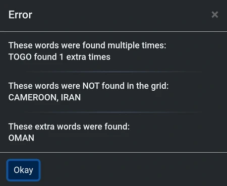 The check grid button is a very useful tool, it will tell you if you have duplicate words, words that are part of the puzzle but not found in the grid, or if a word from the word list not part of the puzzle was found for you to add.