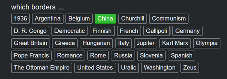 Another sudden death quiz! It's like a cheat code to get on top of the daily takes board. At least China has a whopping 14 neighbours, making this quiz somewhat interesting. Bangladesh and Thailand are just such tricky false answers. Still, I wonder if the quiz maker had ever heard of alphabetical order! I mean, that might force quiz takers to learn the countries instead of just the pattern of correct tiles, but I think this quiz maker might be jumping on the bandwagon a bit too hard. I feel like this was done before, anyway.