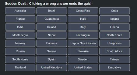 The month of Sudden Death continues! This one is particularly tricky. I, for one, took 5 attempts to get a perfect score. It's the perfect use of the format, really--not very interesting for a text quiz, since you could just spam all the small countries. That feeling of tapping a country where you're not quite sure is quite the rush. Iceland? Suriname? Jamaica? And like most of the best quizzes, half the answers are pretty obvious to give quiz takers confidence and make them want to complete the quiz! Also, I clicked on Namibia instead of Suriname when I took this quiz again to write the blog. It's so tricky!!!