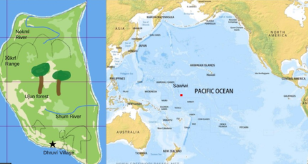 We first created the language during our last-period math class on October 25, 2019. A few weeks later, on November 14, we develop further and made a primitive map (image down below). This map continued to be developed to what it is today. During that time, we also reworked and added to the language, wrote a constitution, invited more members, and created a culture. In February of 2020, we decided that our city names were too similar to English names (we gained independence from the United States and wanted to be culturally different), so we changed most of their names, e.g. Dhruví City to Tímår¬. Our history files also contain various stories about the Sawiwi Island's past, such as how the main religion on the island was created.
