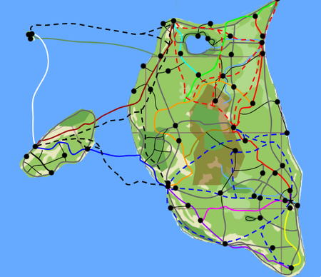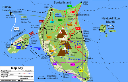 | SH 6 (Sawiwi Island Loop) | Tímår¬ - Bhavo - Shinco Rchiskoffßíst - Rchiskoffßíst - Fyodl Rchiskoffßíst - Ídiskir Puåfu - Uiklczav - Faxityn - Hiubyad - Nuréq - Fyodl Sawiwtov - Sawistov - Eryew Beach - Dhruv Temple - Tímår¬ | |