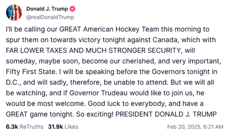 “I know he talked to the USA hockey team this morning,” Leavitt said. “He talked to the players after their morning practice around 10 o’clock; and I also spoke to some folks from that team after. They were jubilant over President Trump’s comments to the team. I believe they’re going to put out a video of that call. So he looks forward to watching the game tonight, and we look forward to the United States beating our soon-to-be 51st state, Canada.”