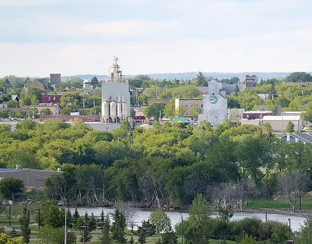 Portage la Prairie - Called Portage for short, this community was once the centre of Louis Riel's failed, unrecognised state, the 'Republic of Manitobah', founded in 1867. Portage, located between Brandon and Winnipeg, is unique in that it was built around a natural oxbow lake (formed when a meandering portion of a river gets cut off, leading to a distinctive, U-shaped lake). The cityscape, itself curves around the lake, known as Crescent Lake.