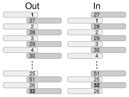 As you can see, in an out-shuffle, the first and 52st cards hold their position. However, in an in-shuffle, no card holds its position.