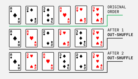 So what, we should shuffle nine times? Counterintuitively, nine perfect out-shuffles is identical to just one out-shuffle. So this won't quite fix the issue. Luckily, you shouldn't have to worry about this since most likely you don't even split the deck perfectly in half when you shuffle. And even if you do perfectly cut the deck, you probably won't perfectly alternate cards from each pile. That being said, you should be fine shuffling as many times as you want, because with each error you make from doing a perfect shuffle, the greater the randomness you will likely end up getting.