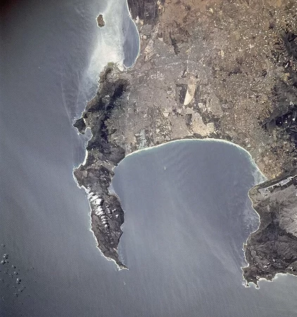 False Bay, Robben Island is visible in the top of the photo.   Seal Island can just be seen as a small white dot in the north of the bay