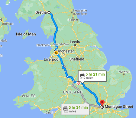 Ignoring the modern timings, you can see from this map that Gretna is 317 miles from London, Montague Street in fact. Not far out from the lyrics, I think you'll agree. So, we are looking for a Montague St. in London. Now, there just happens to be a Montague Street right in the centre of Londinium. Pretty close to the British Museum, actually. Here it is...