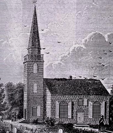 On the left depicts St George's Episcopal Church as it stood in 1734. However following its destruction, the church was rebuilt in 1822 which still stands today.
