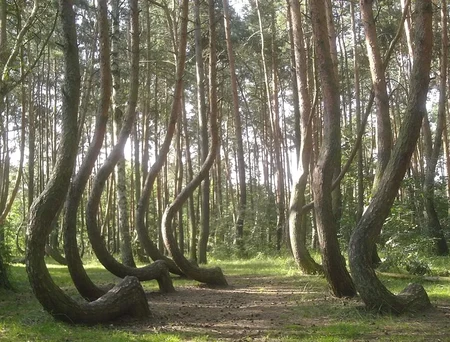 Cette forêt située en Pologne, est composée d'arbres à l'allure étrange. Tous les pins plantés dans les années 1930 présentent un tronc tordu à 90°. En grandissant, ils on repris une croissance verticale. Ainsi, sur 3 mètres environ, ils on une forte courbure. Ils auraient probablement été cultivés de cette façon pour faciliter la construction des bateaux.