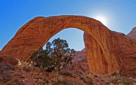 S'élevant à 94 m de haut et s'étirant sur 84 m de long, Rainbow Bridge est le plus grand pont naturel du monde. Il a été façonné dans la pierre par un affluent de fleuve Colorado. Sa couleur varie au cours de la journée, ce qui lui a valu son nom, "Rainbow" signifiant "arc-en-ciel" en anglais. Ce lieu est sacré pour les indiens Navajo et par respect pour leurs croyances, nul ne doit s'en approcher ou passer dessous.
