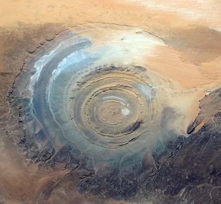 Surnommée l’œil de l'Afrique, cette structure large de 50 km forme au cœur du Sahara de grands cercles emboîtés les uns dans les autres. Visible depuis l'espace, elle constitue même on point de repère pour les astronautes! Les scientifiques ont d'abord pensé qu'il s'agissait d'un impact de météorite. Il est aujourd'hui admis qu'elle résulte de la longue érosion d'un ancien dôme volcanique.