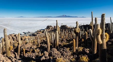 Perché à 3 660 m d'altitude, le Salar d'Uyuni est le plus vaste désert de sel du monde. Entre janvier et mars, il est parfois inondé par les pluies. Il se transforme alors en un miroir géant dans lequel le ciel se reflète. Au milieu, une petite île s'élève hérissée d'immenses cactus en forme de chandeliers. Pouvant mesurer jusqu'à 12 m de haut, certains cactus ont plus de 1 000 ans!