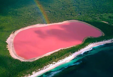 Sur l'île du Milieu, dans l'archipel de la Recherche, s'étale sur 600 mètres de long un lac bien étrange. Le rose éclatant de ses eaux contraste avec le vert profond de la forêt d'eucalyptus qui l'entoure. Cette coloration serait due à la présence de bactéries et de micro algues. L'eau de ce lac est très salée mais vous pouvez vous y baigner en toute sécurité!