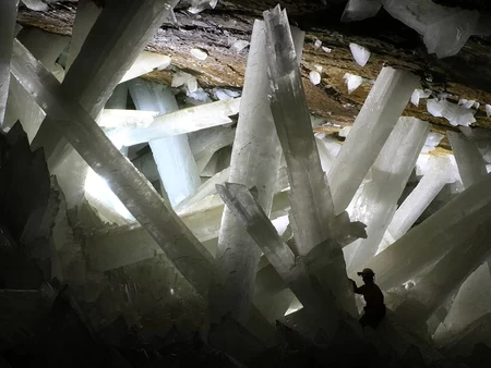 La mine de Naïca, dans l'État mexicain de Chihuahua, se compose d'une série de caves hors du commun, abritant des cristaux de sélénites géants. La plus spectaculaire d'entre elles, baptisée la Grotte des Cristaux, a été découverte en 1999. Les cristaux mesurent jusqu'à 12 m de long pour un diamètre de plus de 1 mètre. À côté, l'homme sur la photo paraît tout petit!
