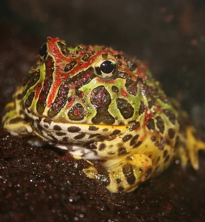 When you first think of a frog, well, your imagination is limited. There are stereotypes of ordinarily colored green frogs, which are present, but many frogs have quite riveting patterns, such as the ornate horned frog. The name of this amphibian originates from the horn-like folds of skin above the eyes. Primarily spread through the tropical and mountainous rainforests of South America (particularly Argentina, Uruguay, and Southern Brazil), the ornate frog's striking color patterns serve a quite useful purpose, camouflaging the amphibian in the depths of the forest floor. When prey is near, the frog ambushes its prey, devouring it in no less than one or two gulps, earning it the nickname "Pac-Man Frog".